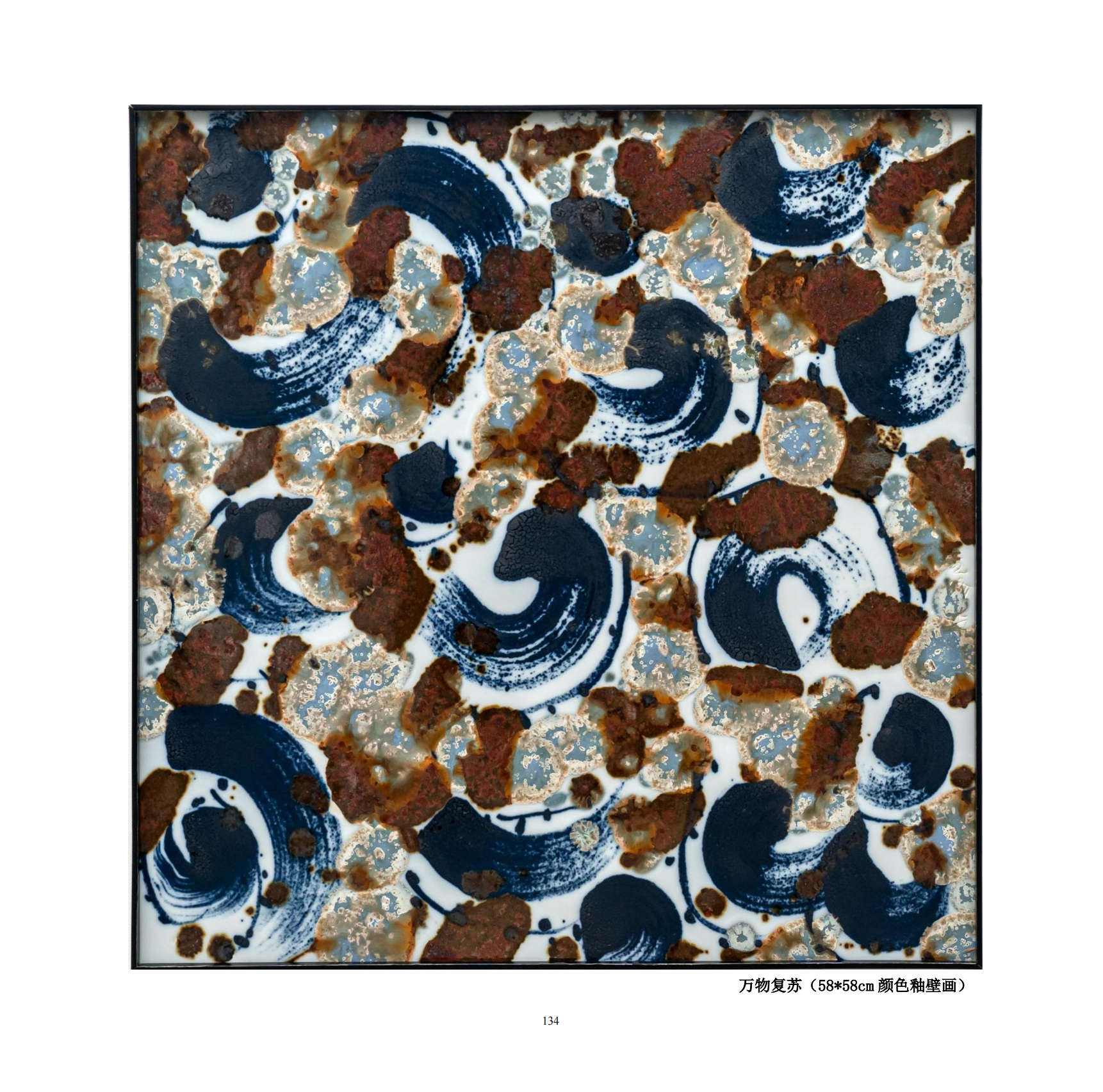 在题材表达上,黄修林融合后现代主义的解构手法与抽象主义的符号提炼,运用拼贴、错位等独特视觉语言,表达心中对自然与生命的深刻感悟。在《万物复苏》这幅陶瓷壁画中,深蓝、棕褐与金色相互交织,色彩釉点和灵动曲线经拼贴组合,仿佛生命元素在混沌中碰撞聚合,展现出自然万物在新生力量驱动下蓬勃复苏的景象。