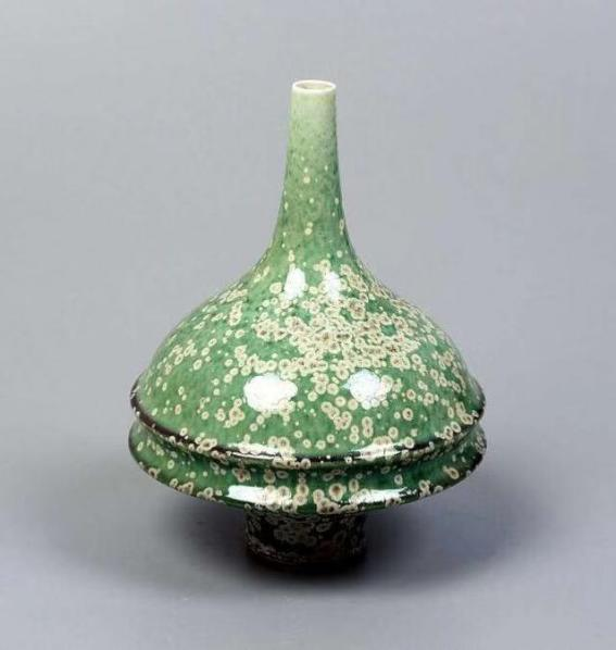 在釉色运用上,《梅花瓶》以绿色梅花结晶釉点睛,釉面在高温下自然形成冰裂纹理,宛如寒梅在瓷胎上悄然绽放,美不胜收。这种对自然意象的抽象表达,既保留了青瓷的简约美学,又借助现代釉料技术为作品注入了新的生命力。在他看来,传统需要被“拆解重组”:“旧东西得用新表达,年轻人看了才会觉得这东西和自己有关。”